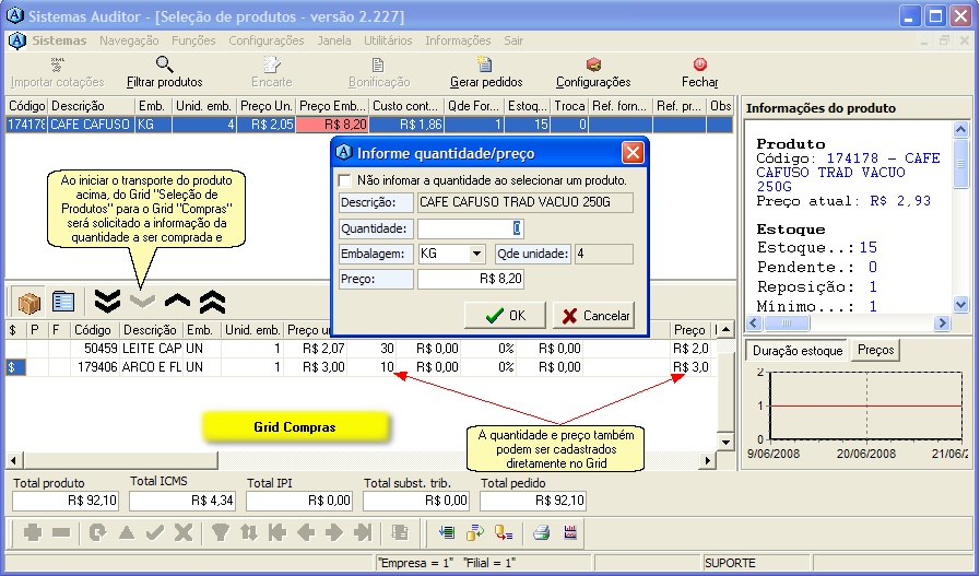 Para que o sistema nunca apresente a caixa acima para "Informar quantidade/preço", configure em: Configurações do "Módulo Seleção de Produtos"
