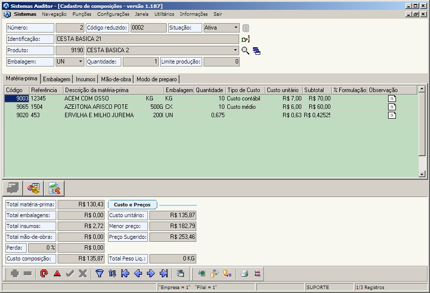 No cadastro da composição do módulo de PRODUÇÃO, inserir os itens que fazem a composição do produto "Cesta básica"